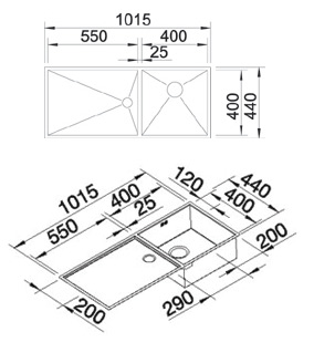 Схема встраивания для мойки Blanco Zerox 400/550-T-U чаша справа Нержавеющая сталь зеркальная полировка [Нержавеющая сталь] Нержавеющая сталь 521606