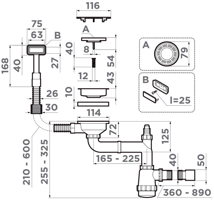 Арматура для одночашевых моек со скрытым прямоугольным переливом WK-1-S AB